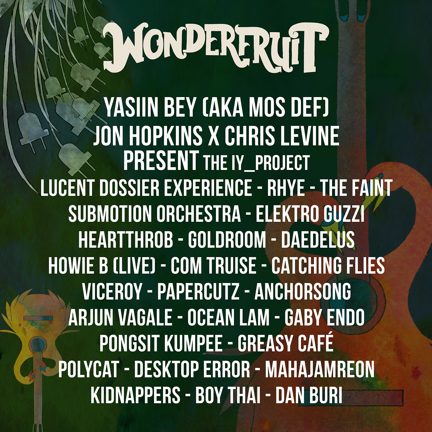Initial lineup announcement includes The Faint, The Submotion Orchestra, Jon Hopkins x Chris Levine, Howie B, Dapayk Solo, Desktop Error, Mahajamreon and Polycat. It was later announced that legendary hip hop artiste Yasiin Bey, R&B duo Rhye and the breathtaking, twirling, fire-breathing cirque performers of Lucent Dossier Experience will be joining the event as well.