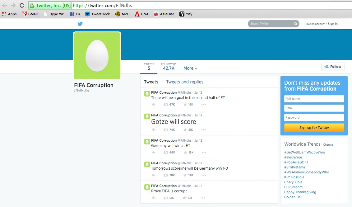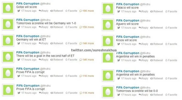 Needless to say, “FIFA Corruption” gained thousands of followers, as many as over 42,000 followers, since Goetza’s goal. About 14 hours before the final started, it posted a number of tweets which seemed to predict the correct outcome. Word for word, play by play.