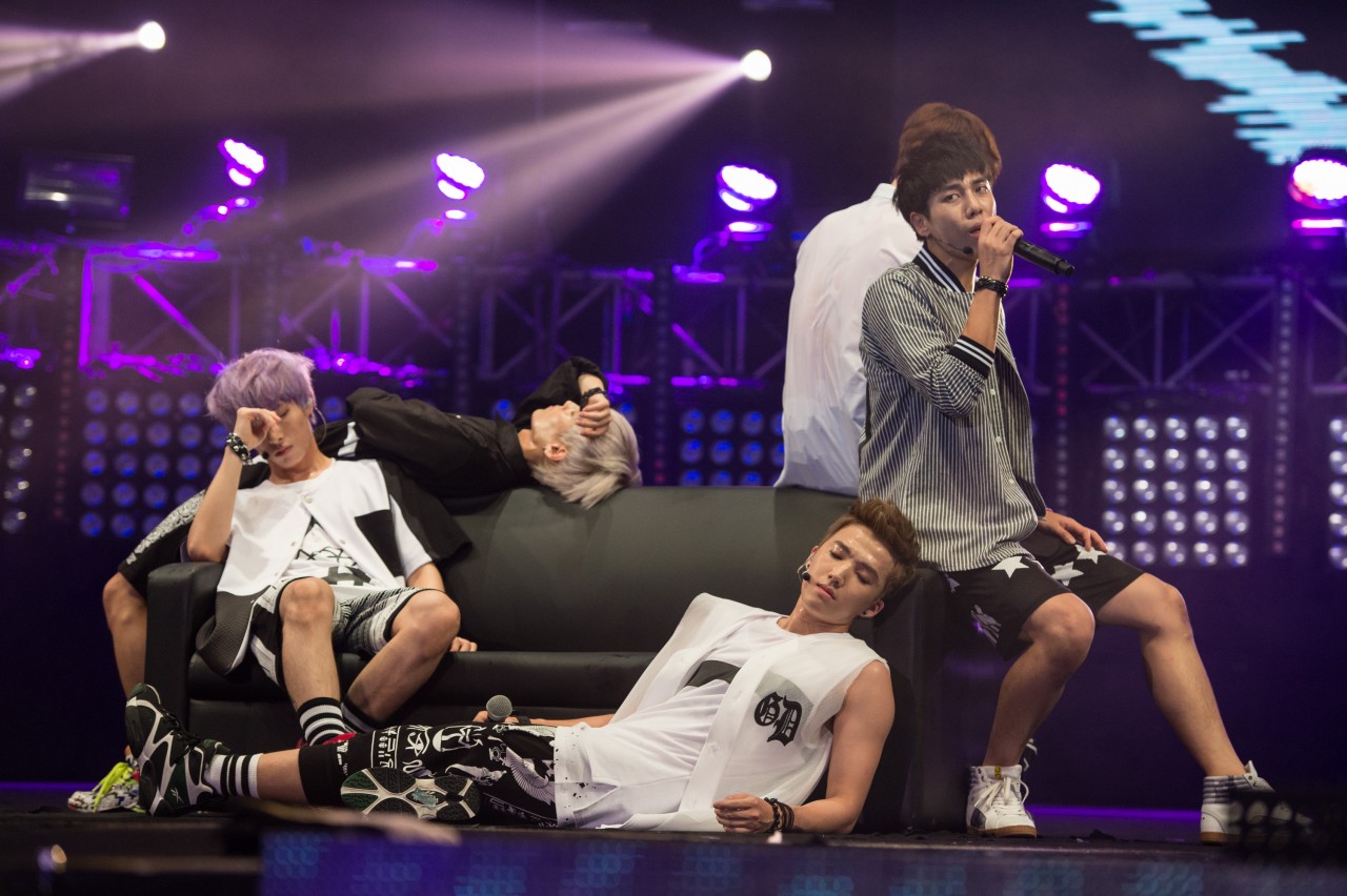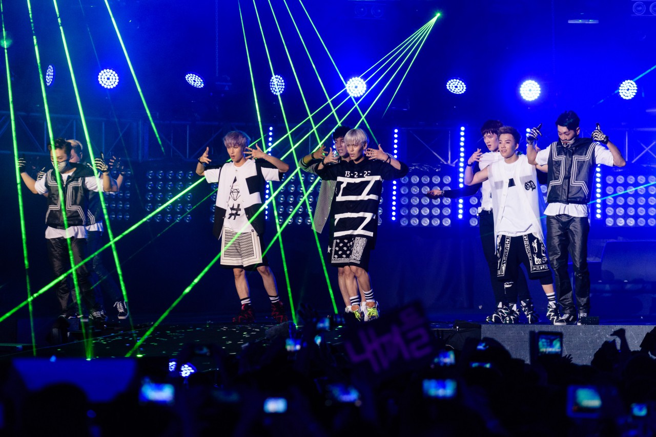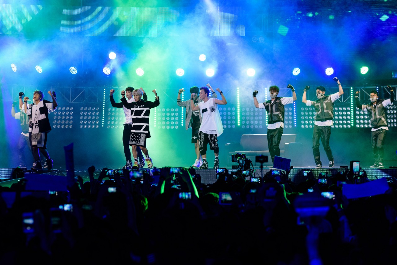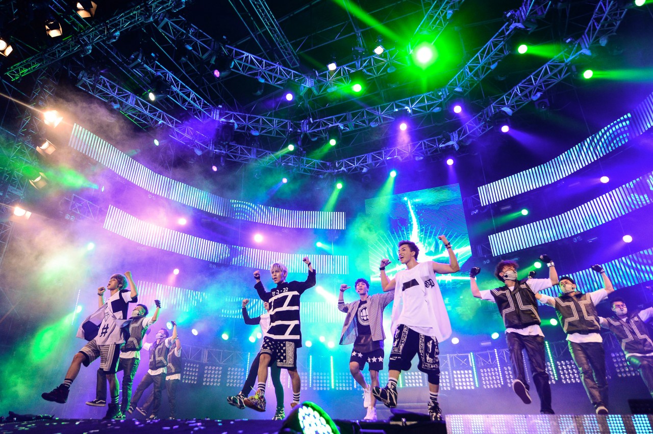 During the performance of Boy Republic’s remix of “Video Game”, 15-second mobile phone clips that were posted on Instagram with the #worldstagemyfancam were featured on the screens. A lucky fangirl, who was chosen to become their “girlfriennd” was unveiled during the performance for “Dress Up” as well, leaving the audience screaming with jealousy. Towards the end of their set, the group once again hyped up the crowd with the fan favourite, “Party Rock”.