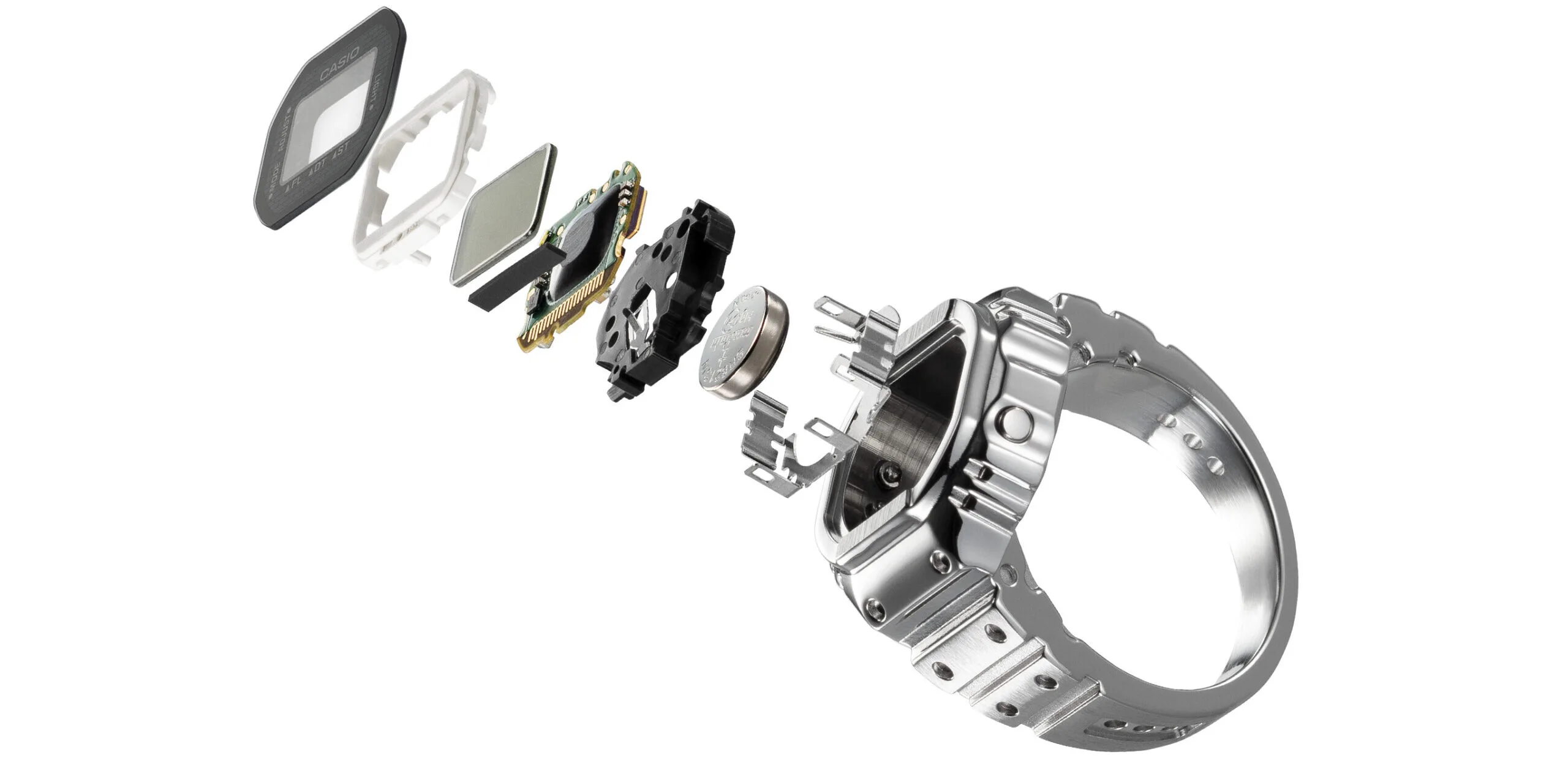 Producing a ring-sized, full-metal version of the Casio watch requires the use of metal injection molding (MIM), a method of metal processing in which fine metal powder is injected into molds. The case, case back, and ring are molded in a single piece, faithfully reproducing the Casio watch’s complex form, down to the dimpled design on the band.