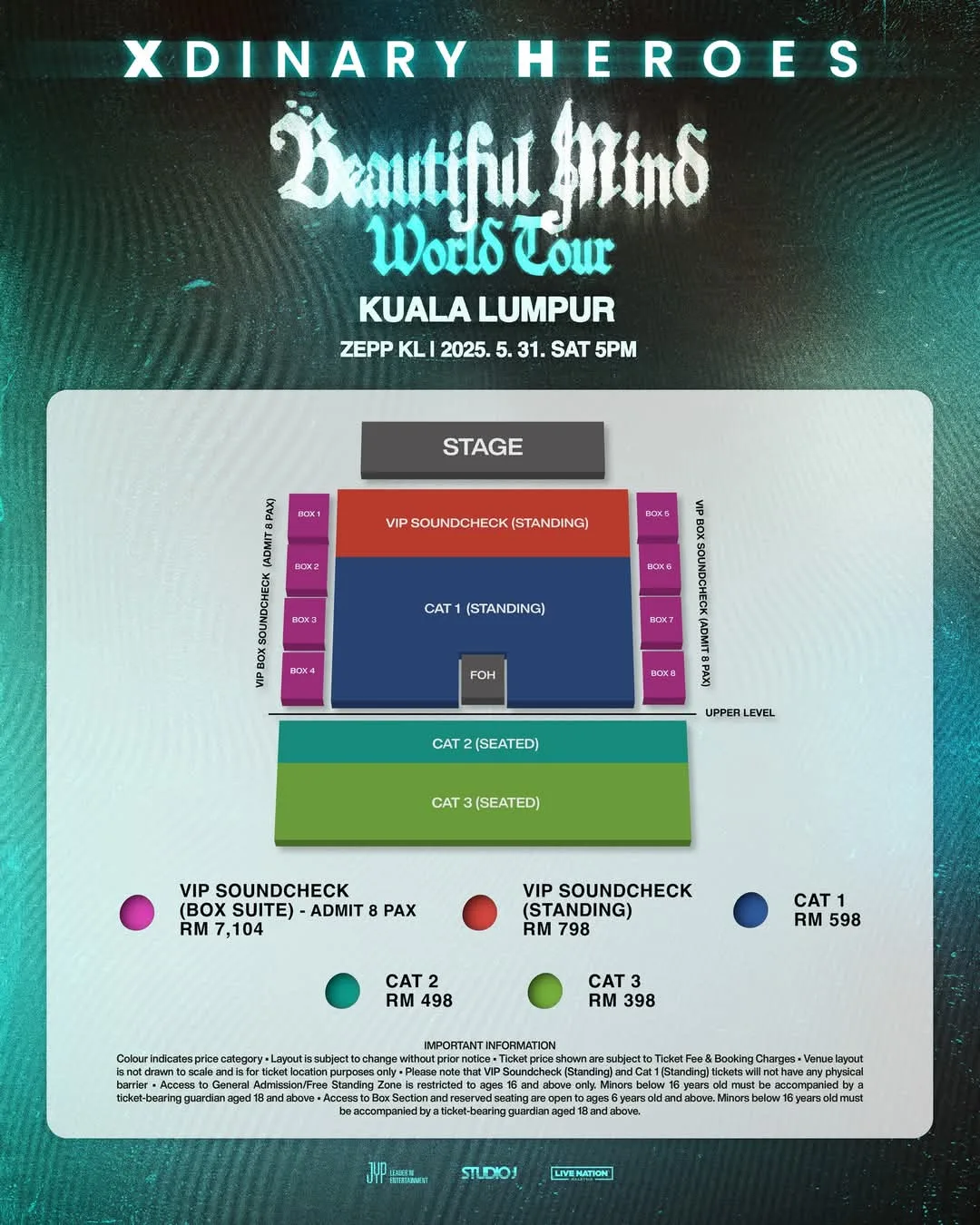 - Ticket Prices: RM798 (VIP Soundcheck – Standing), RM598 (CAT 1), RM498 (CAT 2), RM398 (CAT 3)