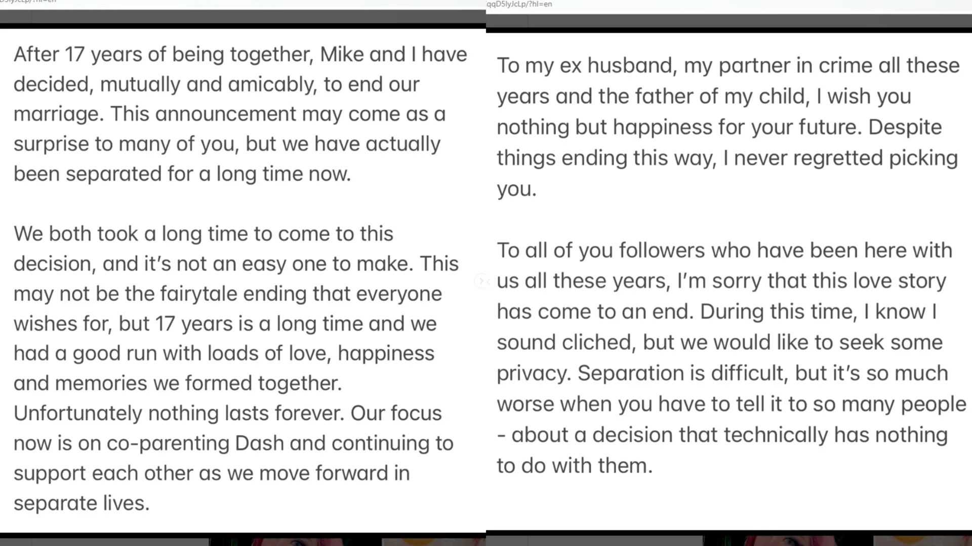 “After 17 years of being together, Mike and I have decided, mutually and amicably, to end our marriage. This announcement may come as a surprise to many of you, but we have actually been separated for a long time now.