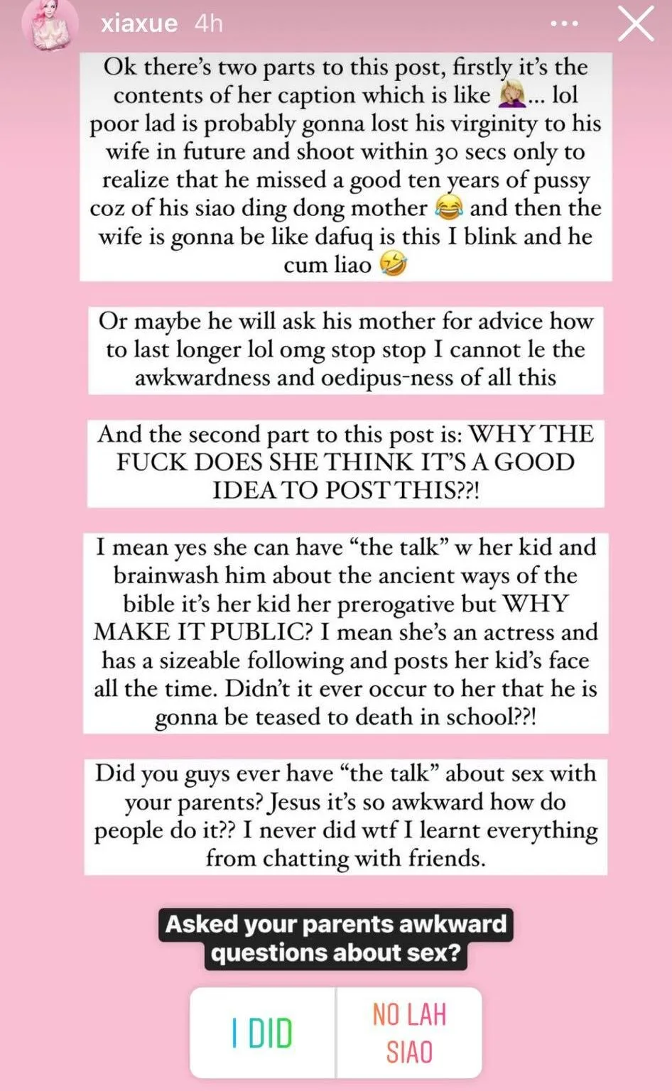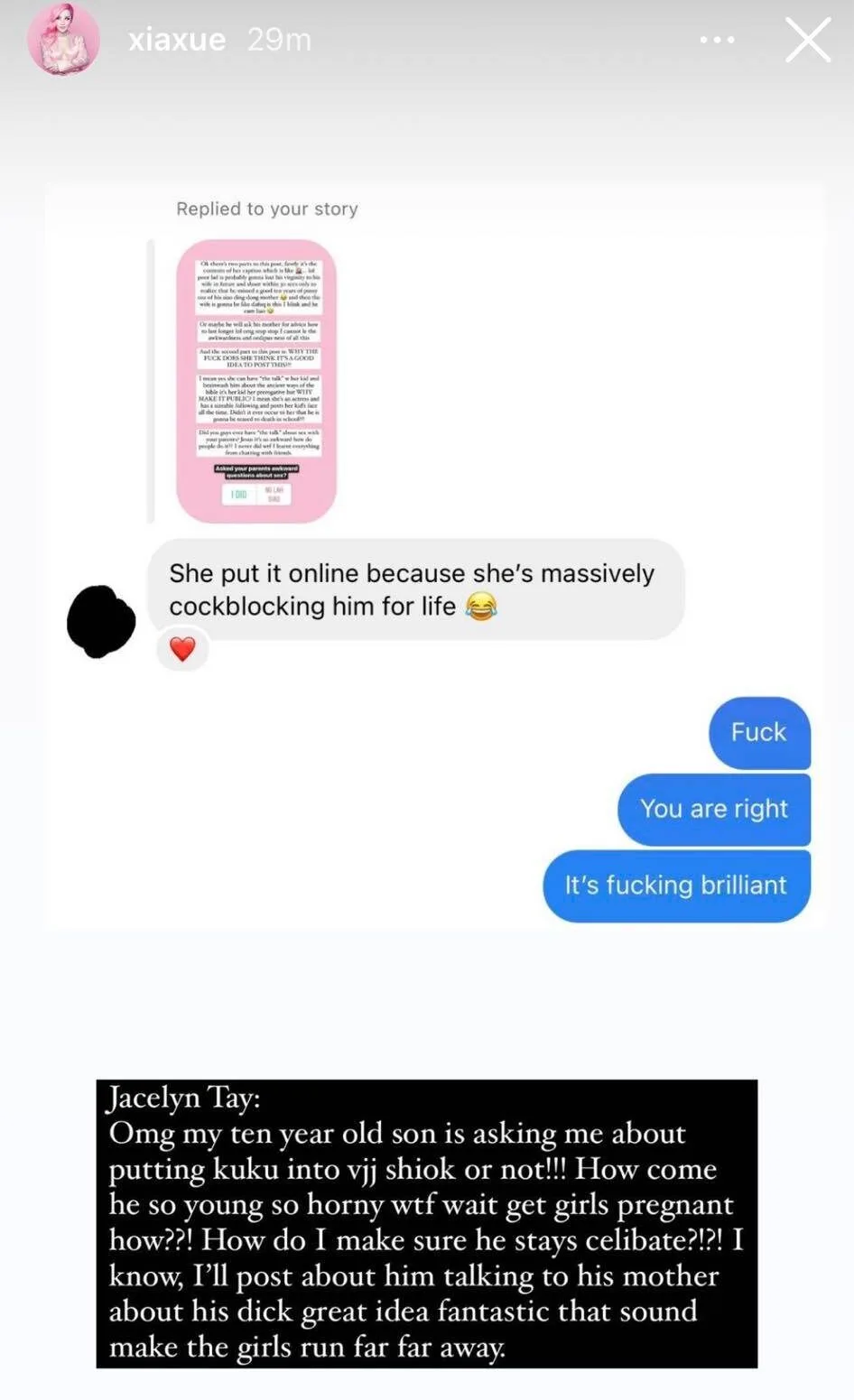 After ranting about how she felt about Jacelyn’s controversial post, Xiaxue also commented that Zavier might now end up being the butt of the joke among his peers. “Didn’t it occur to her that he is gonna be teased to death in school?” the vocal influencer asked.