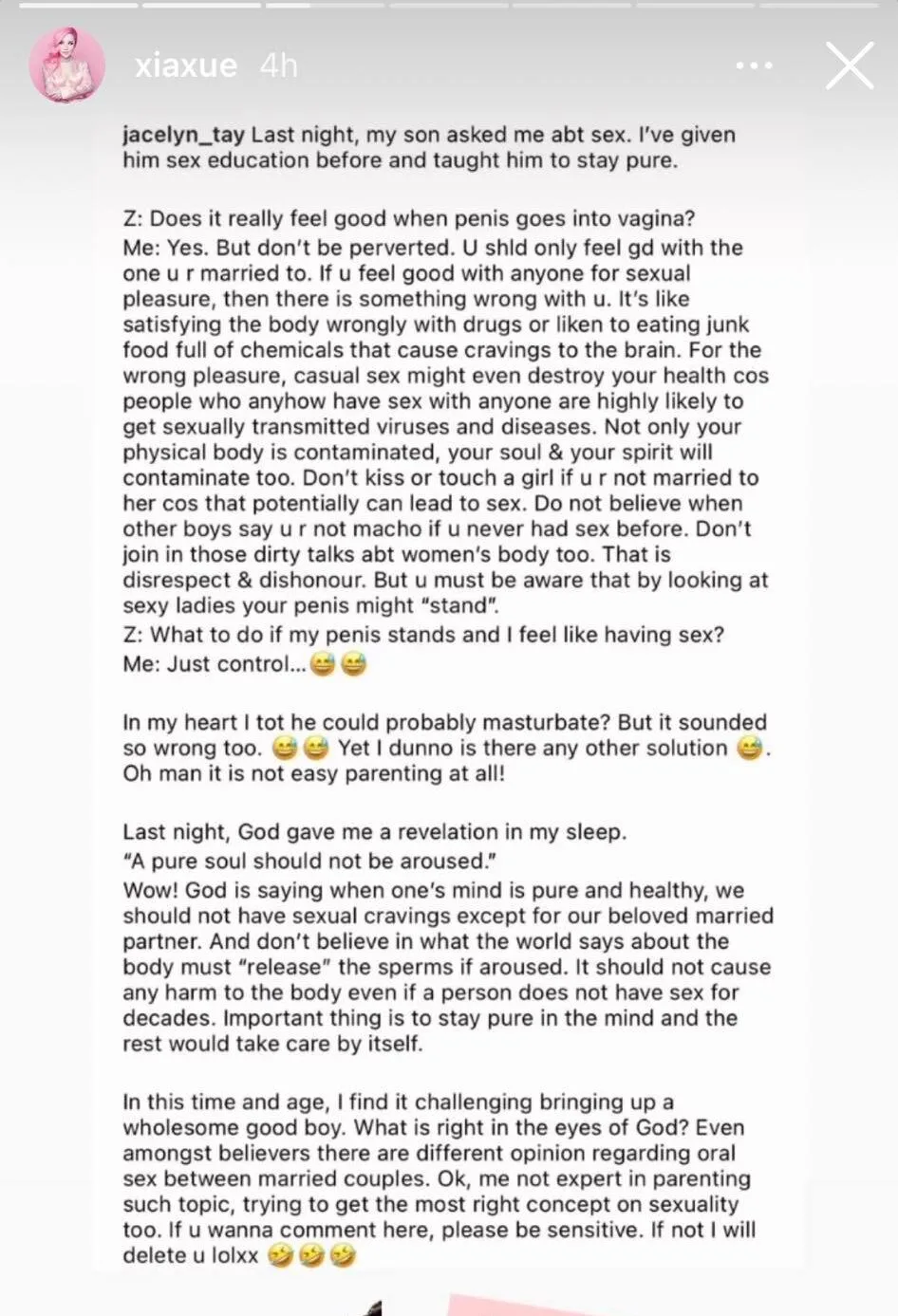 Here’s where it gets interesting. Jacelyn insisted that Zavier should never kiss a girl as it could lead to sex. The Singapore actress also came to the realisation that if her son remains “pure”, he should not get aroused. While some complemented her openness in sharing this, others question if it was wise to share this private conversation to the public.