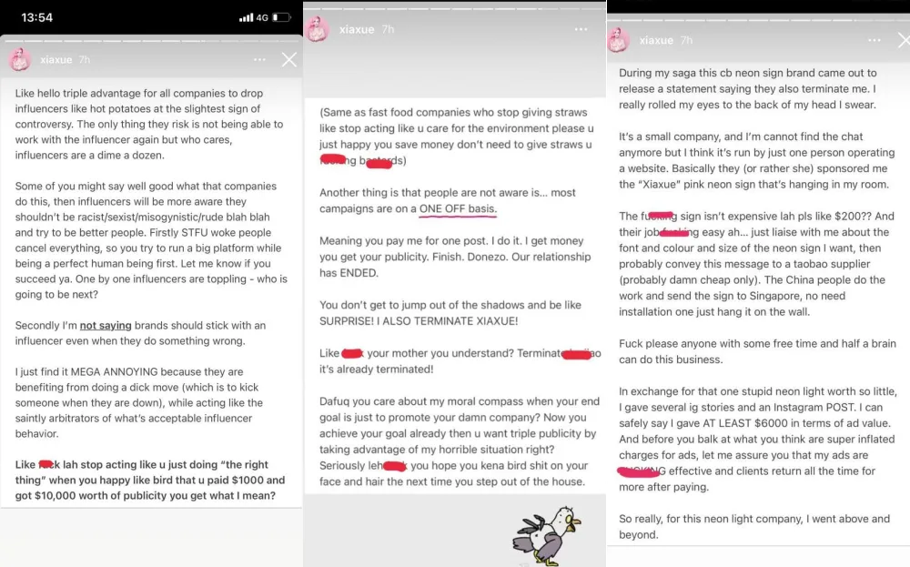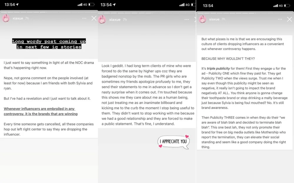 What pisses her off are the clients that take the easy way out the moment an influencer gets embroiled in a controversy. When this happens, Xiaxue argued that the brand(s) stand to gain “triple publicity”: