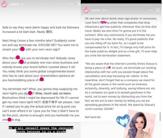 In addition to sharing her own bad experience with a small neon sign brand that took place last year, Xiaxue is suggesting to perhaps add a clause in the contract for clients to compensate the influencer, should they choose to terminate a contract. “No really, it’s good publicity that you are riding off my back for, so I ought to be compensated for it,” she said.
