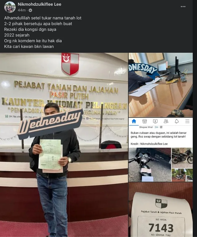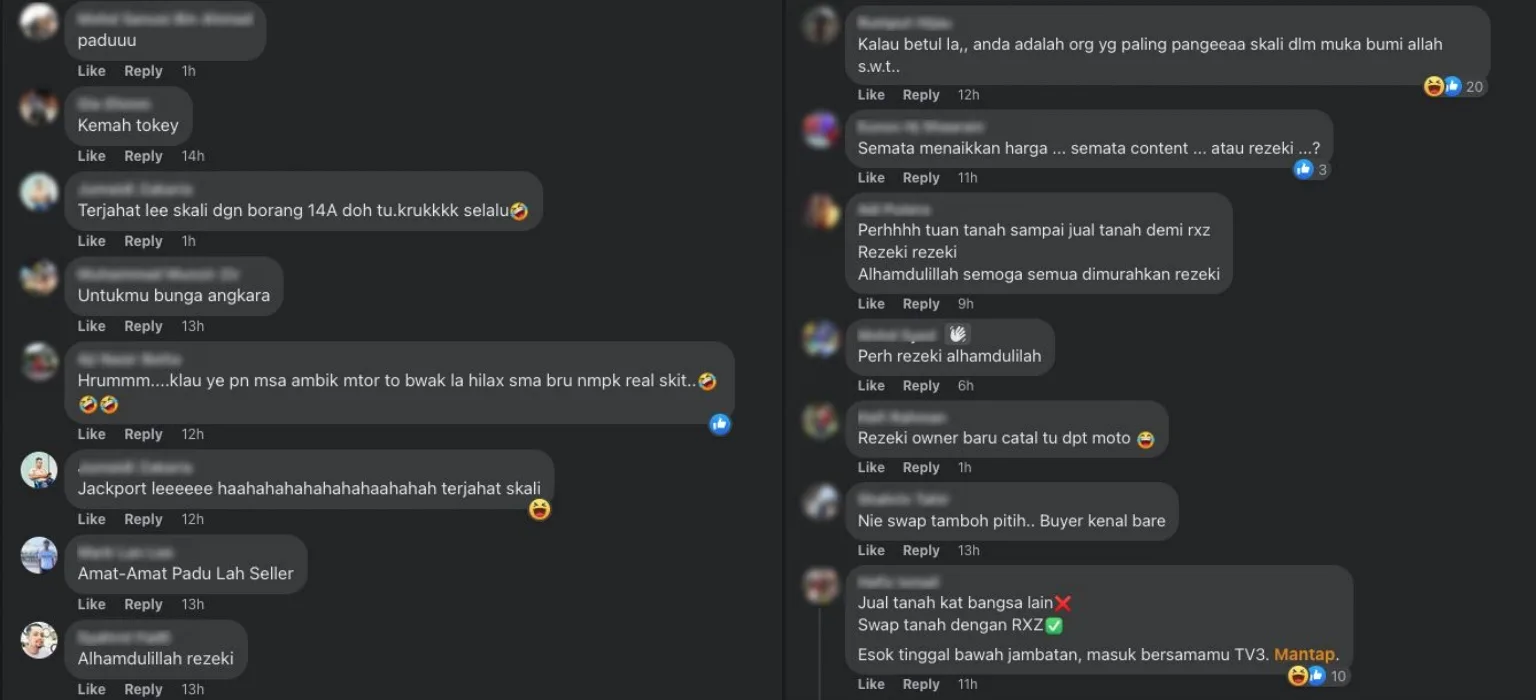 While Nik didn’t disclose the exact value of the RX-Z bike or the land lot, fellow “Kelab Jual Beli RXZ” club members congratulated him on the deal. However, some netizens were shocked when the agreement was made known, especially regarding the original landowner’s decision.