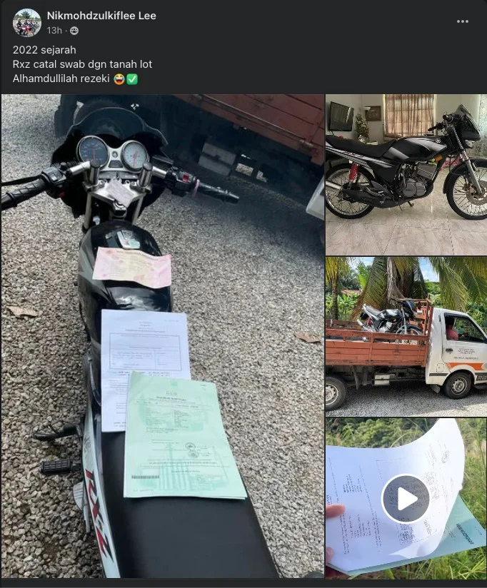 The owner of the rare bike, known as Nik Mohd. Zulkifli Lee shared the good news through a Facebook group, “Kelab Jual Beli RXZ” yesterday (17th August). “2022 history, RXZ Catalyzer swapped with a land plot. Praise to God, (my) blessing,” he wrote in the post.
