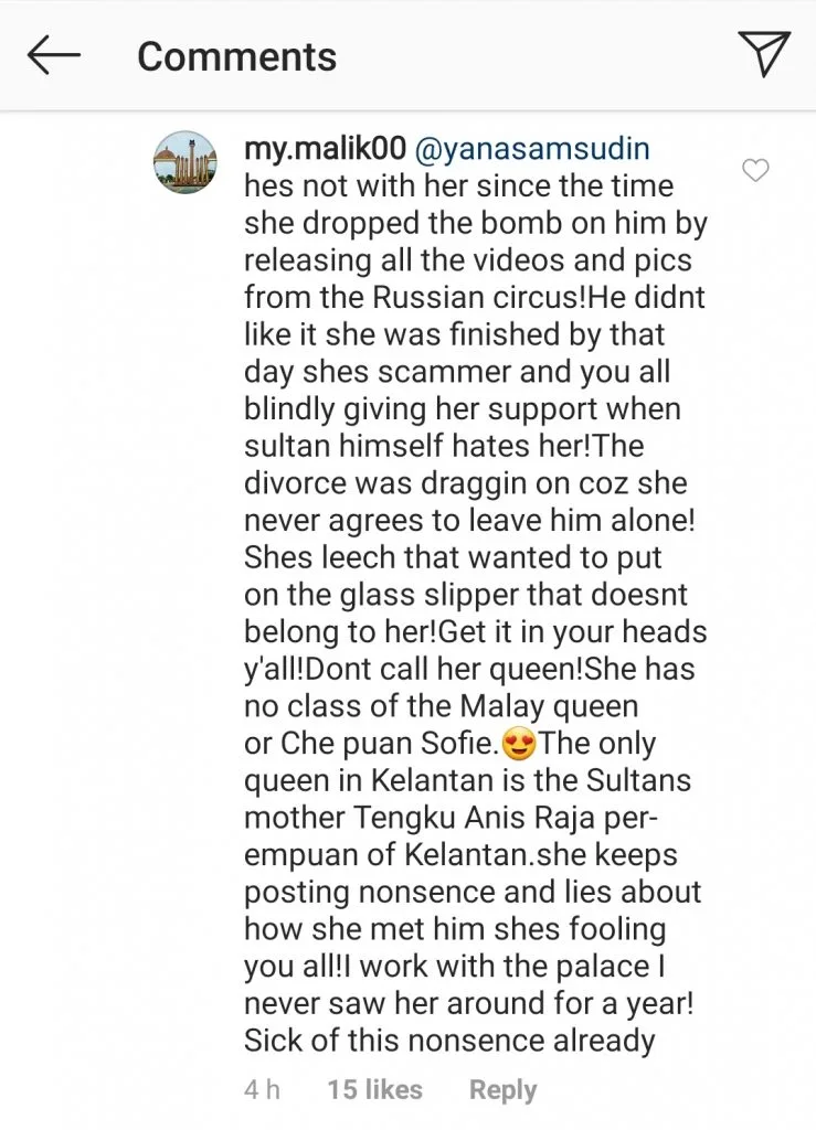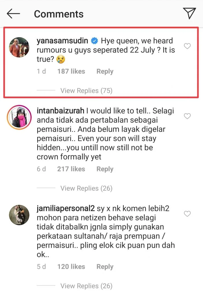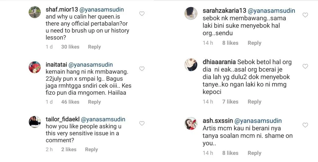 As such, many netizens stormed to the Russian model’s Instagram page to question her about the divorce rumour, including Malaysian actress Yana Samsudin.