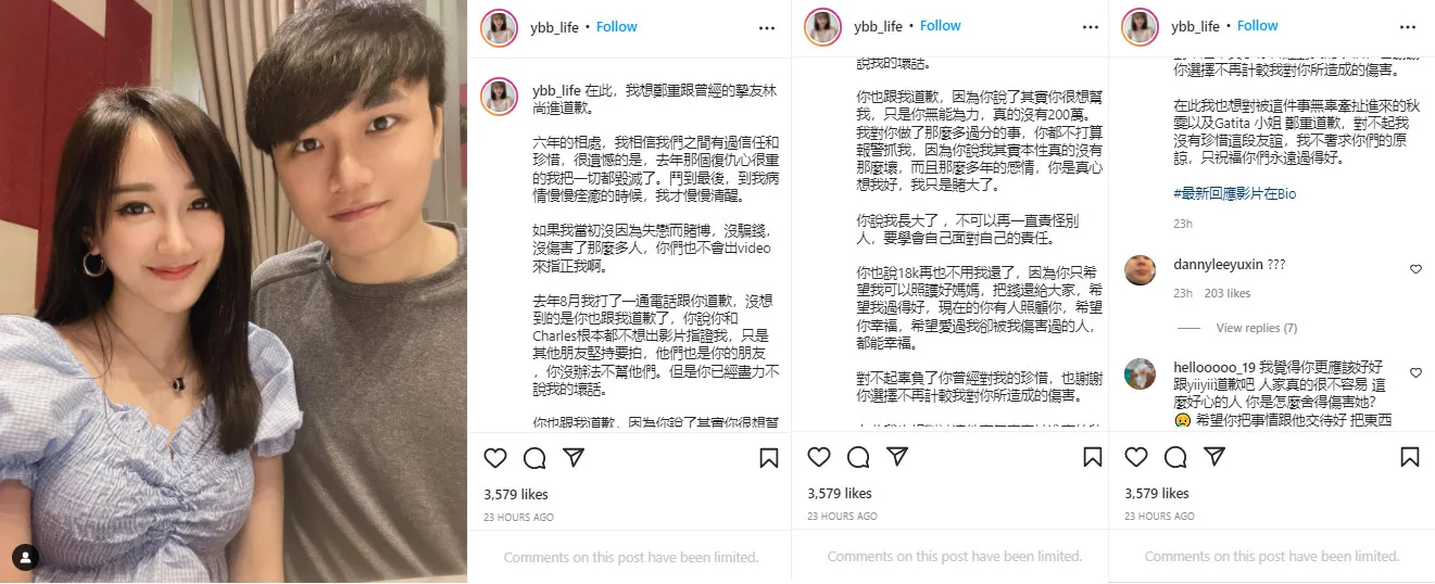 Shang Jin had wanted to help her with her debt, but didn’t have enough money. Additionally, he decided to not press charges against her as he still wanted the best for her. “I’m sorry for letting you down after you cherished me,” she wrote. “Thank you for choosing to (ignore) the harm I did to you.” YBB also publicly apologised to Qiu Wen and Gatita Yan as they were “innocent but involved in the incident“. “I do not ask for your forgiveness, but I wish you a good life forever,” she said.