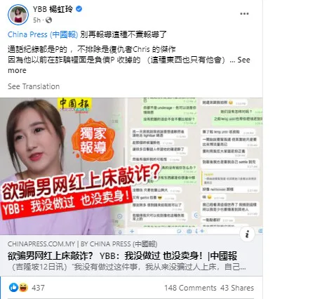 Additionally, YBB brought up some claims China Press had made in an article. Apparently, someone had approached the Chinese media claiming to be a friend of YBB’s. The source alleged that YBB had tried to blackmail a certain influencer by tricking them into bed with her. YBB had supposedly gotten the influencer drunk and brought them to bed. Afterwards she purportedly blackmailed him by reporting him to the police for rape, unless he followed her orders. YBB denied the claims and added that the source was not factual at all.