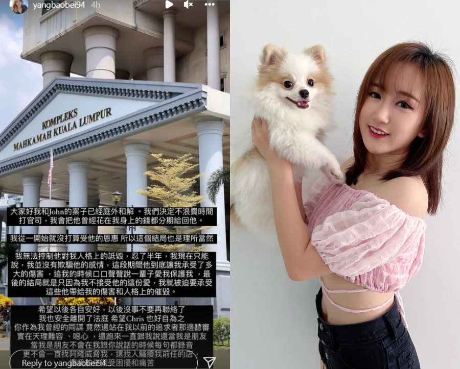 YouTuber Yang Bao Bei (杨宝贝) has been having bad luck with men. She was last heard from after her “wedding” stint with “Malaysian Wang Leehom” (大马王力宏) aka Kiang Jau Sang (江昭上). Now, apparently fellow YouTuber Chris Hoo was waiting for her outside the courthouse!