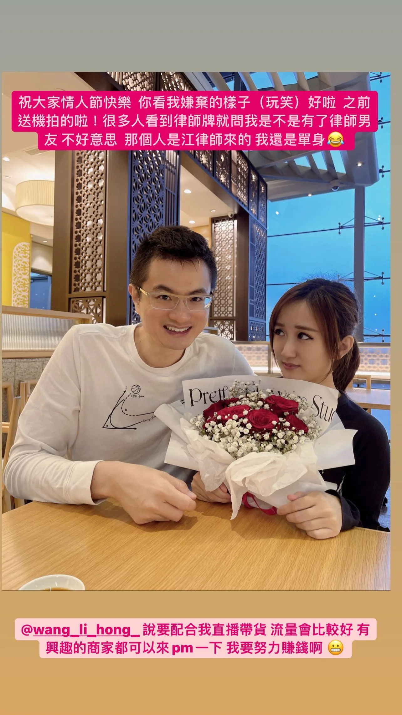 The controversial public figure was showered with a bouquet of red roses from the self-proclaim “Malaysian Wang Leehom” (大马王力宏) aka Jau Sang (江昭上). He even uploaded a short TikTok video of their dinner date and included Wang Leehom’s “Forever Love” in it.