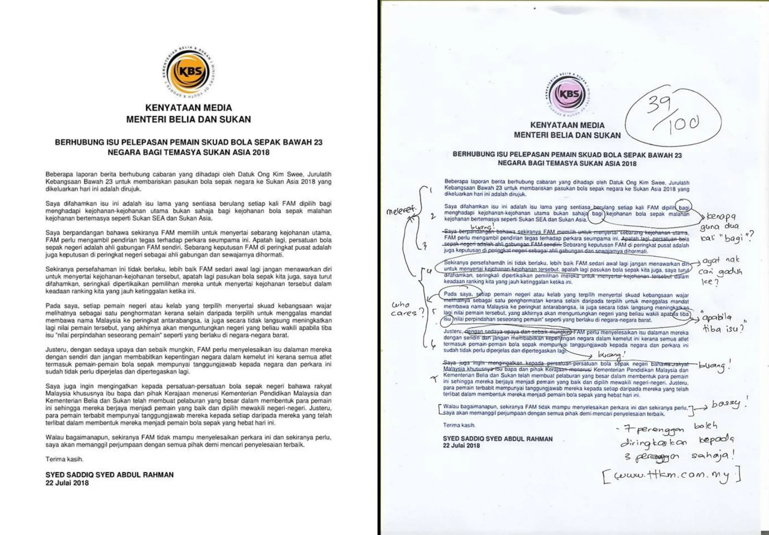 Local satirical site Tentera Troll Kebangsaan Malaysia (TTKM) has pinpointed out all of the grammatical errors and redundant sentences found in the statement, and they’ve also scored the press release 39 out of 100 percent for its poor writing.