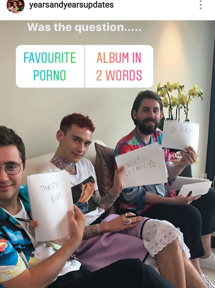 “Thirsty Bish”, “Sensual Cosmic”, and “Sex Robots” – favourite porno or album in 2 words? Years & Years posted this question to the fans last week while they were in Singapore.