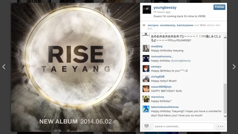 Also, Taeyang has been talking about working on a solo album for about two years now. It’s safe to say that we’re just as excited as everyone else! “Rise” is set for a 2nd June release so keep your eyes and ears peeled for it.