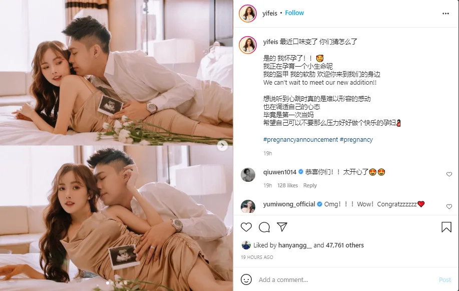 “Yes, I’m pregnant!” Yi Fei announced happily. “I’m pregnant with a little life. My armor, my weakness, (I) welcome you to our side. We cannot wait to meet our new addition!” Although she is excited, the influencer admitted that she was adjusting her mentality in preparation for the pregnant life. She also revealed that her taste buds have changed thanks to the changes in her body.