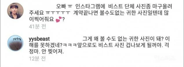 One B2UTY commented on Yoseob’s post saying, “Oppa, please upload a bunch of pictures of all of B2ST together on Instagram. If your contract ends they’ll become rare, hard to find photos, so please take a lot while you still can?”