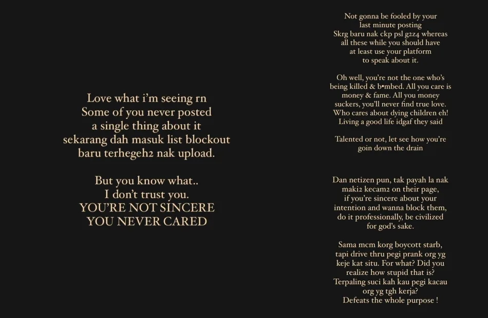 The “KL Special Force” star’s criticism was not only towards local celebrities but was also extended to netizens who have been attacking them on social media. The public figure sternly reminded netizens to be more civilised when it comes to boycotting brands and celebrities and avoid causing more trouble.