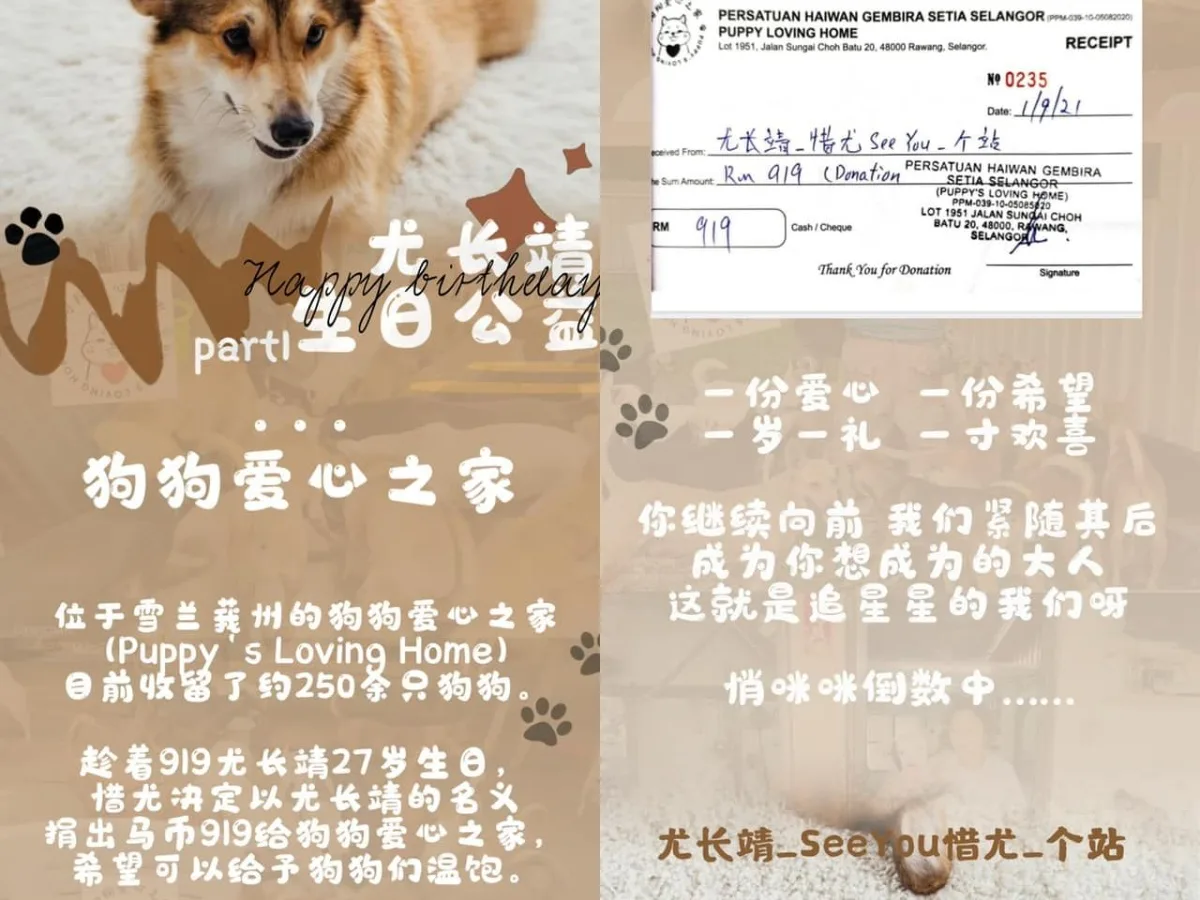 Azora’s fanpage on Facebook “You Chang Jing See You Station (尤长靖惜尤seeyou个站)” revealed that the first charity was a dog shelter. According to the post, the shelter named “Puppy’s Loving Home” in Selangor which currently hosts over 250 dogs. RM919 had been donated under Azora’s name in hopes of providing food and other necessities for the dogs. They chose the number 919 specifically as his birthday is on the 19th of September.