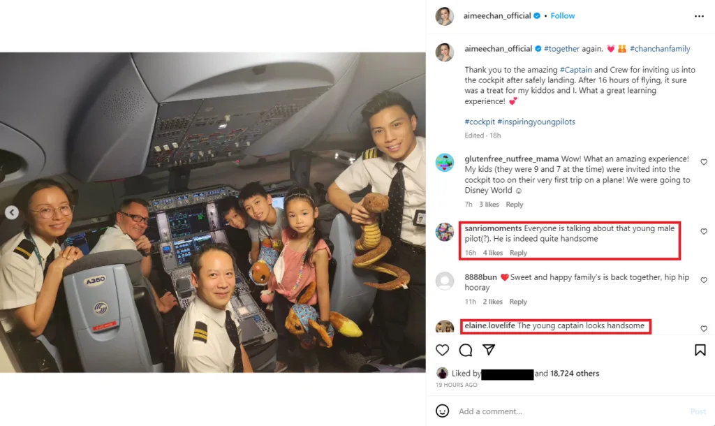“Thank you to the amazing captain and crew for inviting us into the cockpit after safely landing. After 16 hours of flying, it sure was a treat for my kiddos and I. What a great learning experience!” the actress praised in her caption. However, fans were more taken by the captains, with several commenting that one young captain in particular “looks handsome“.