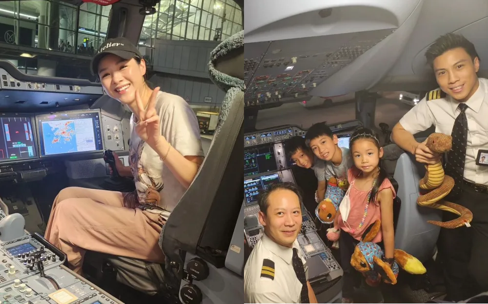 Aimee Chan and her kids have been away holidaying in Canada and finally returned to Hong Kong yesterday (16th August). Well, not only did she get a wonderful reunion with her husband, her flight’s captain gave her family a special treat; a visit to the plane’s cockpit! But, it seems netizens got distracted by someone else instead.