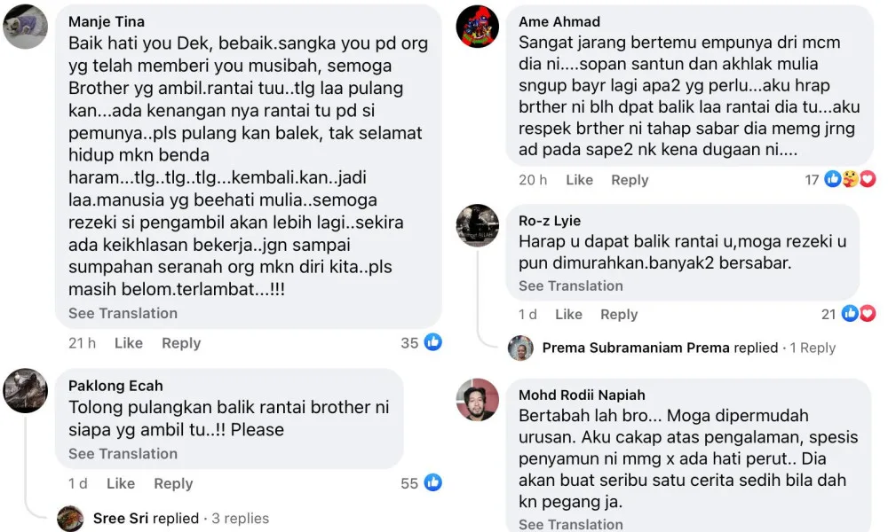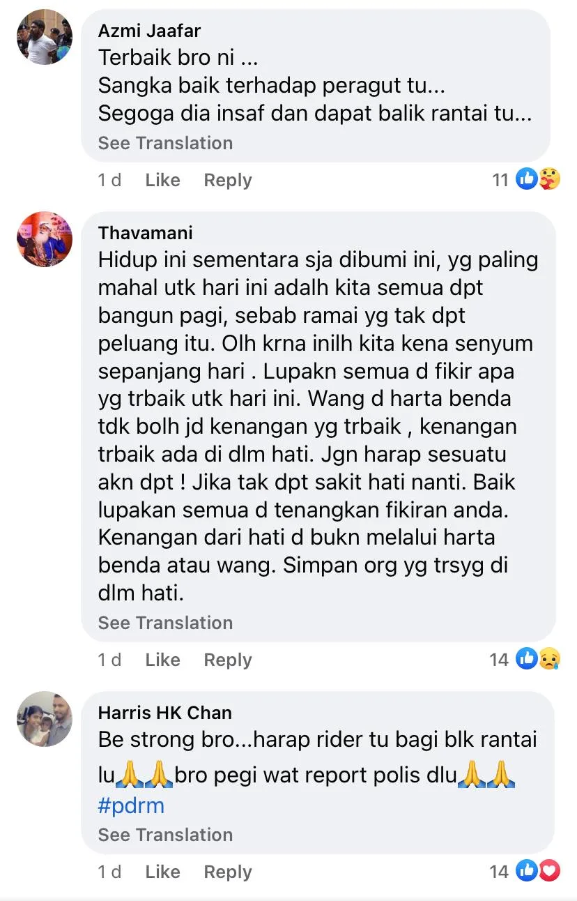 He then continued by pleading for the stealer to return his beloved pendant necklace back to him. On top of that, he also offered to give RM500 to the rider if the person really needed the money especially during this tough time.