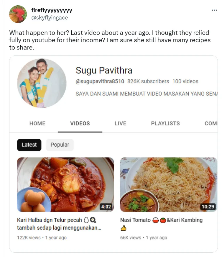 The matter was brought to light by a Twitter user named @skyflyingace. “What happen to her? Her last video was uploaded about a year ago. I thought they relied fully on YouTube for their income? I am sure she still has many more recipes to share,” the netizen questioned.