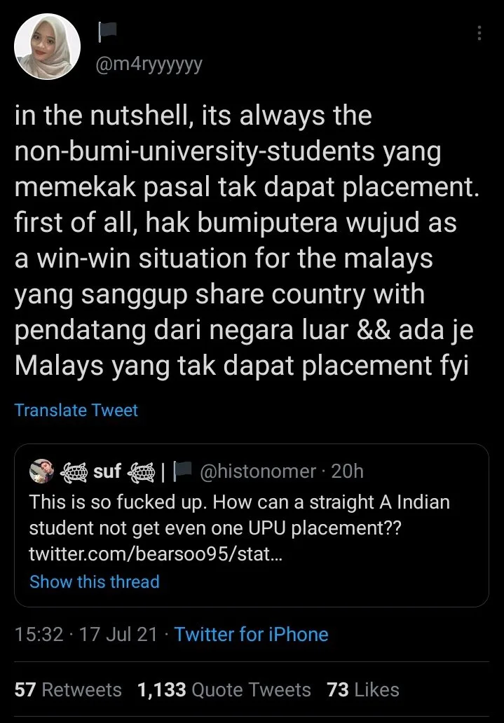 A few days ago, a tweet made its rounds on social media and sadly, it made everyone realise that our broken system that reeks of systemic racism is going to be the bane of the nation. The tweet, posted by Twitter user, @m4ryyyyyy, stated, “In the nutshell, it’s always the non-bumi university-students yang memekak pasal tak dapat placement. First of all, hak Bumiputera wujud as a win-win situation for the Malays yang sanggup share country with pendatang dari luar negara & ada je Malays yang tak dapat placement FYI.”
