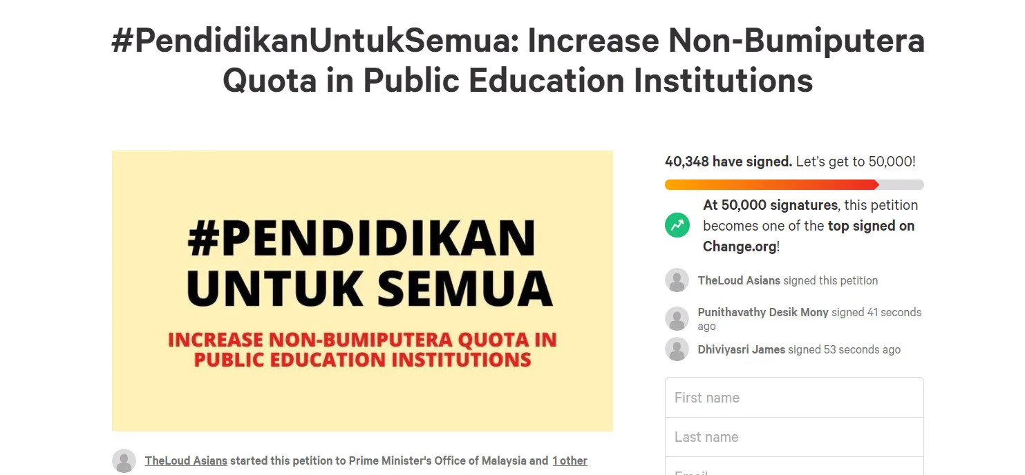 Following this, a petition was created on the famed petition website, Change.org. The #PendidikanUntukSemua petition was created by The Loud Asians and as of, 20th July, 5:39pm, it has garnered 40,348 signatories. The accompanying statement of the petition reads, “It is 2021, yet there are reports of non-Bumiputera Malaysians with stellar results who do not get a placement in the public education sector. Even in 2019, 90% of public education seats were reserved for the Bumiputera, whilst only 10% was given to other Malaysian races. It is time for Malaysia to have a fair public education system. The rakyat demands for the attention of the Prime Minister of Malaysia Muhyiddin Yassin, Senior Minister of Education Datuk Dr. Radzi Jidin and his deputies* to: