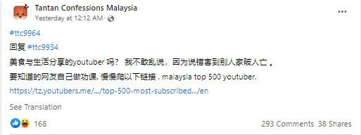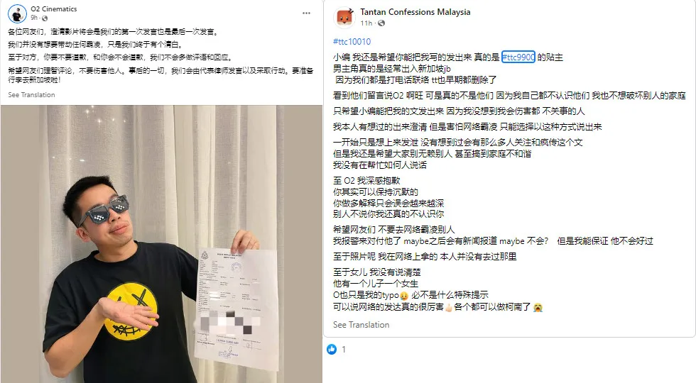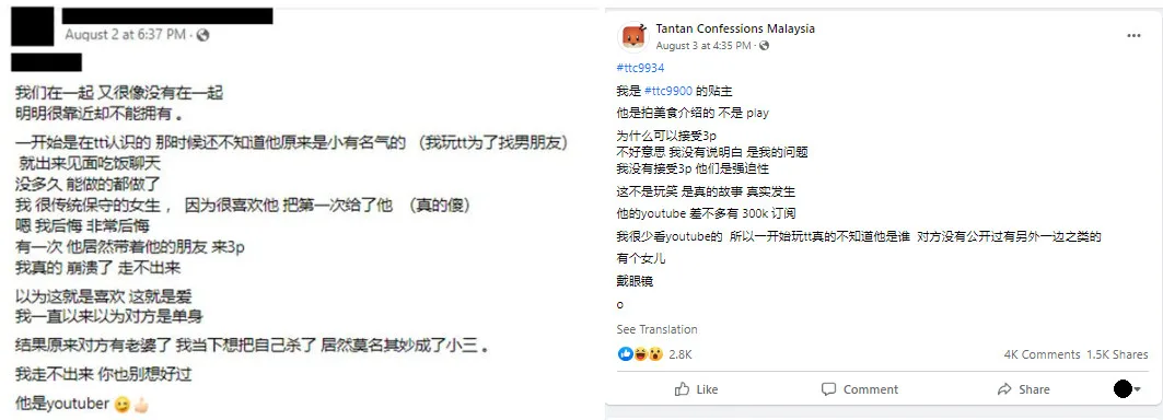 The post first circulated on Facebook group Tantan Confessions Malaysia. According to the anonymous netizen, she met the celeb via a dating app. At the time, she was not aware of he was an internet celeb, nor did she know he was married. The netizen claimed she had only intended to meet and chat with them. But, not long after the two got together, she decided she liked him enough to have sex with him.