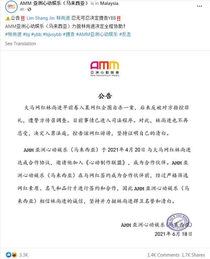 Not long after his appearance in the courtroom, AMM Asia Entertainment announced on Facebook that Lim Shangjin would be suing YBB. According to the announcement, Lim could no longer bear the slander. He had decided to file a lawsuit against her for defamation and insisted on proving his innocence. AMM declared they believe in Lim’s integrity and will be siding with him.