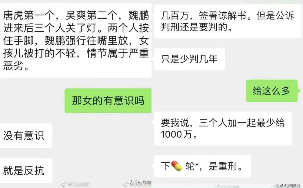 According to screenshots of a conversation, Wei Peng and the duo others allegedly drugged a girl before sexually assaulting her. Tang Hu had gone first, before the other man, then last was Wei Peng. The girl reportedly did not stop struggling during the assault. However, she was supposedly beaten to unconsciousness.