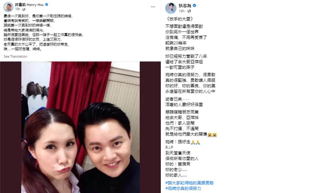 Taiwanese singer Henry Hsu (許富凱) shared that he had met Yuan-chi through their work, but was impressed with her as a person. “It was really fun to work together at that time. You are a good person, motivated and hardworking,” he wrote. “God is really unfair to (take) you who was such a good person away. (Ah), have a nice trip.” Family friend Herman Ti (狄志为) too lamented her loss, praising Yuan-chi’s kindness and bravery.