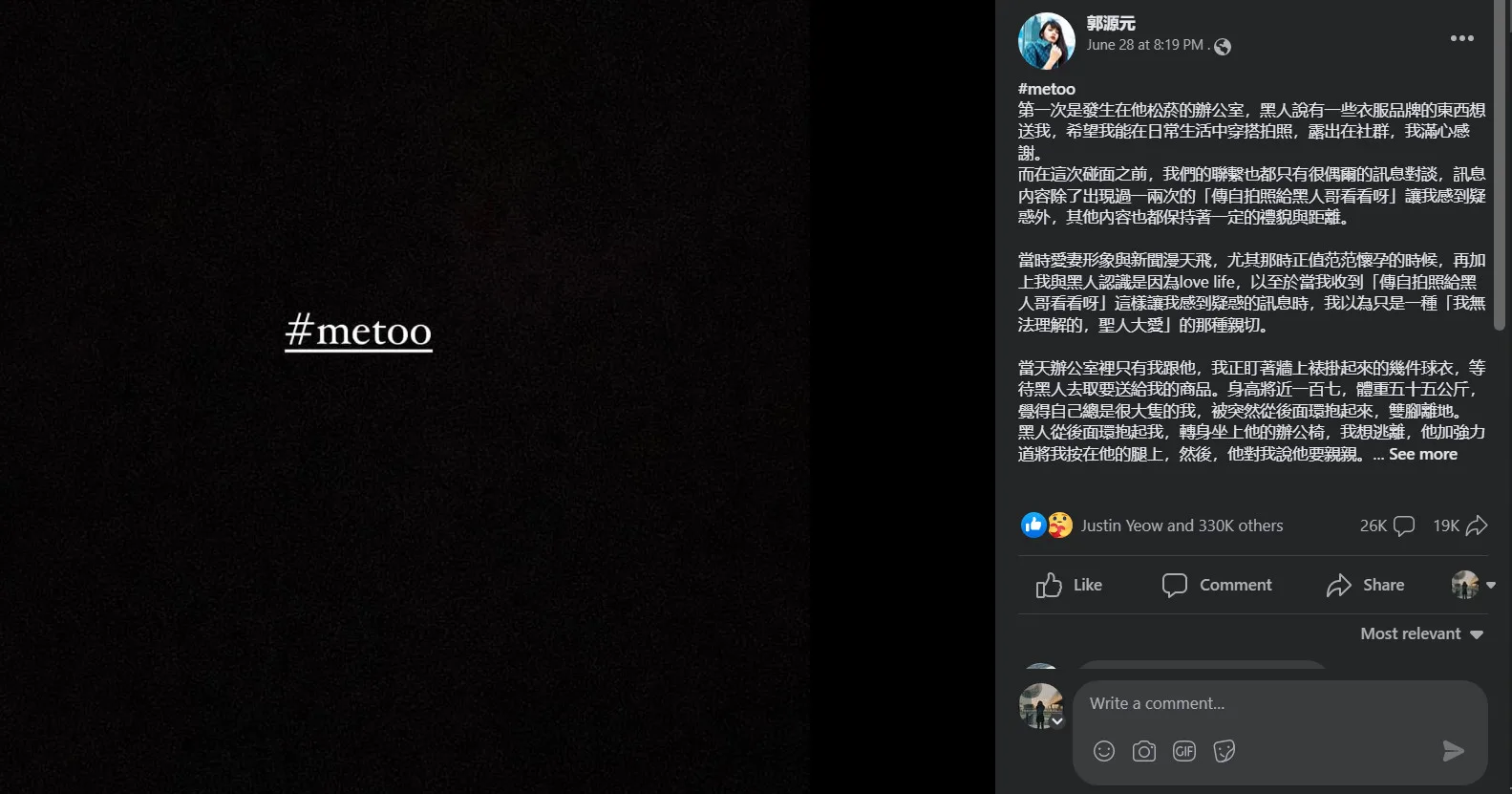 Yuan Kuo shared her traumatic experience on Facebook with just a black picture with the words #metoo. In the long post, she wrote that the first time she was sexually harassed by the TV host was in his office. Blackie mentioned that he wanted to pass her something, but he suddenly hugged her from behind. He then requested for kisses. With not much of the choice because of their size differences, the artist relented so she could leave the office immediately.