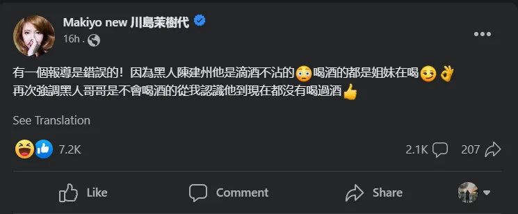 On the other hand, mixed Japanese and Taiwanese singer Makiyo Kawashima (川島茉樹代) mentioned on a TV show before that Blackie would recklessly kiss females when he was drunk. However, she backtracked on her past comment. It reads, “There’s one report which is wrong! Because Blackie Chen is a teetotal, the one drinking are the girls around him. Let me emphasise, Brother Blackie does not drink any alcohol, since I’ve known him, he’s never drink.”
