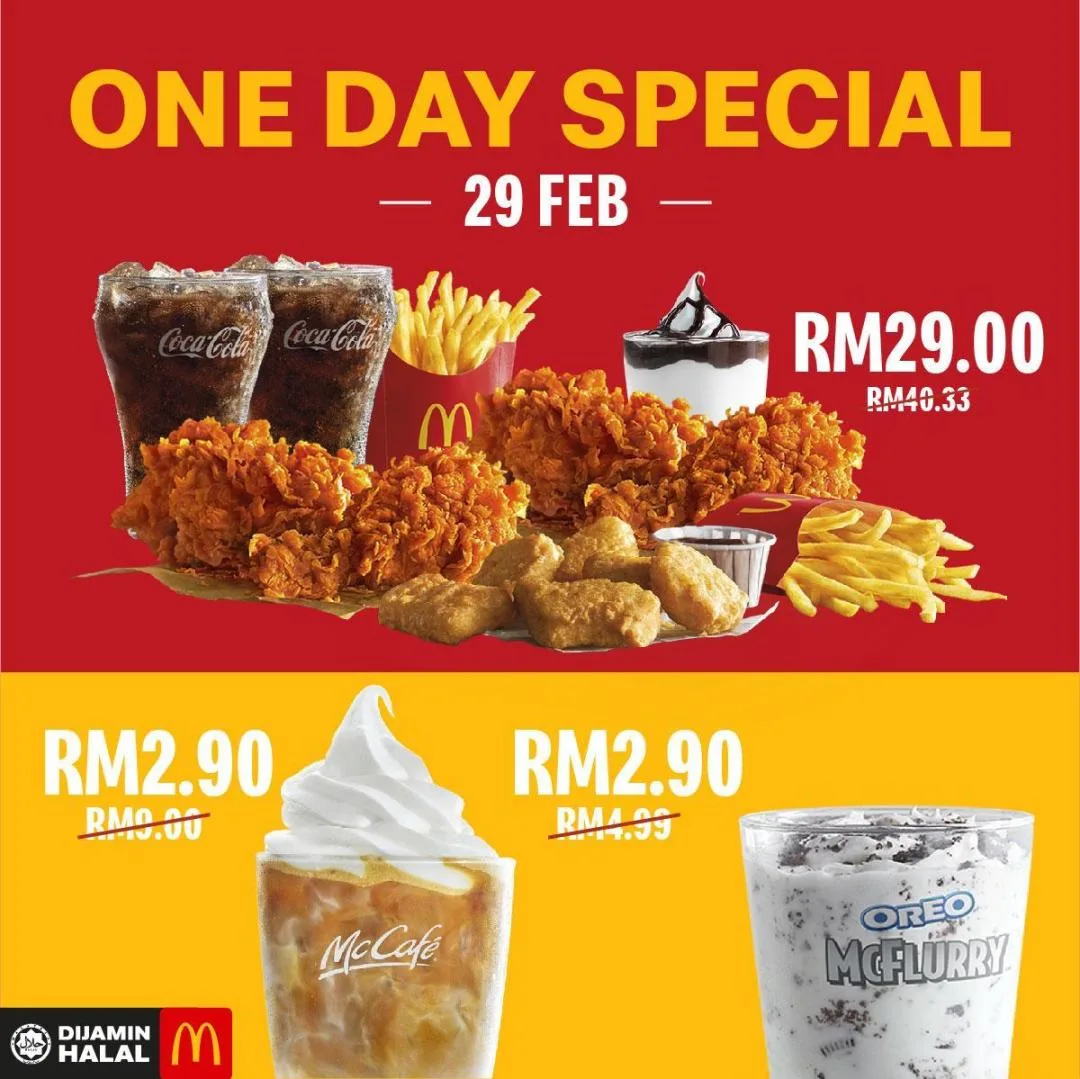 McDonald’s is also joining in on the fun to make 29th February 2020 a super special day. Treat yourselves to a bundle of McDonald’s favourite treats (Ayam Goreng McD, McNuggets, Chocolate Sundae, fries, and coke) for only RM29.90 via the McDonald’s App. Don’t just stop there – order Oreo McFlurry or Iced Coffee Float for only RM2.90.