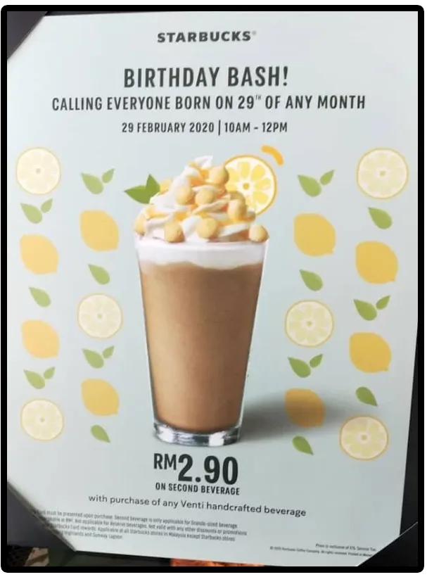 RM2.90 for a second beverage at Starbucks? Yes please. This promo is only valid tomorrow between 10am – 12pm. Here’s the catch, you or your buddy has to be a leap year baby.