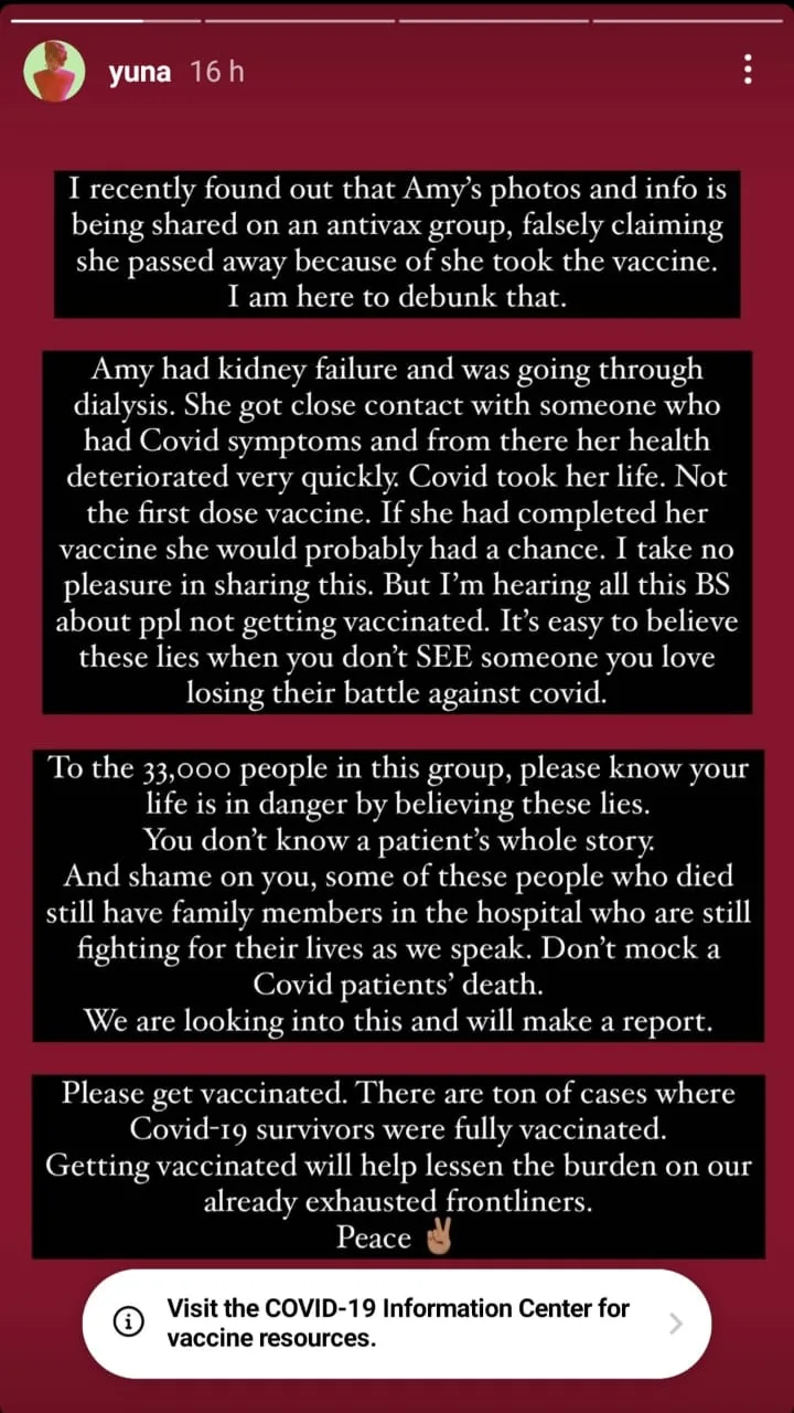 “Covid took her life. Not the first dose vaccine. If she had completed her vaccine she would probably have had a chance. I take no pleasure in sharing this. But I’m hearing all this BS about people not getting vaccinated. It’s easy to believe these lies when you don’t SEE someone you love losing their battle against Covid,” she wrote.