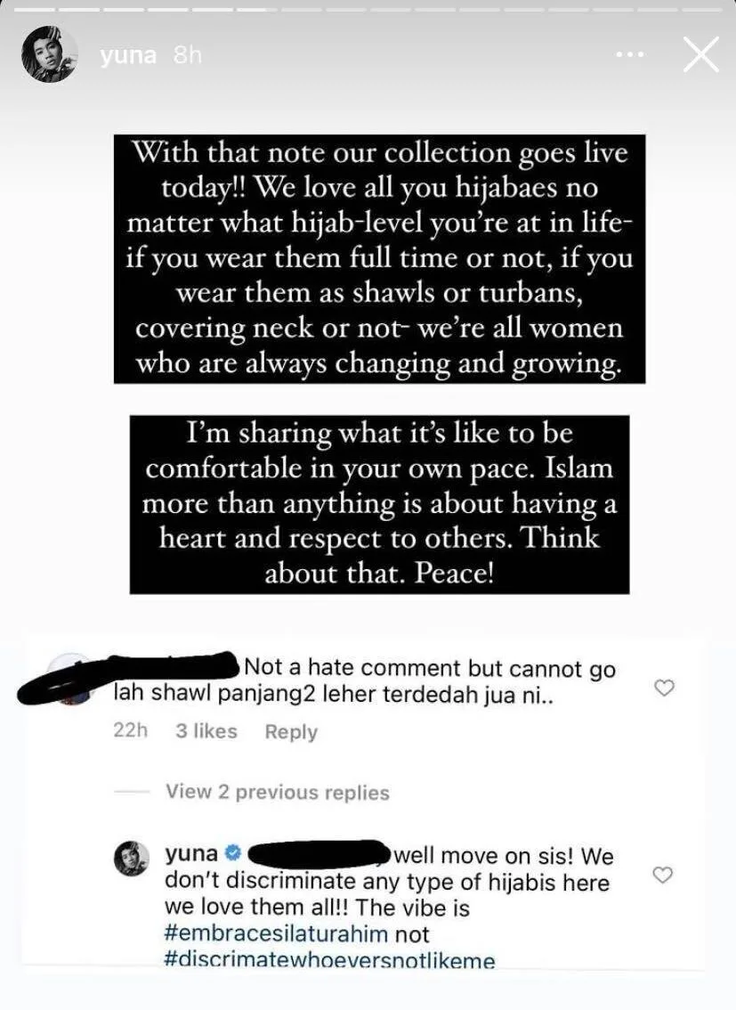 Clearly, this IG user’s remark didn’t sit well with Yuna. She replied, “Well, move on sis! We don’t discriminate any type of hijabis here, we love them all! The vibe is #embracesilaturrahim (Embrace friendship) and not #discriminatewhoeversnotlikeme (Discriminate whoever’s not like me).”