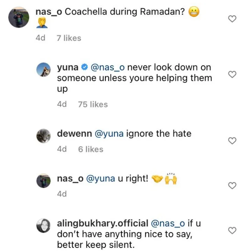 Yuna captioned the photo, “Here for a few hours to perform with @tokimonsta. Wore my own merch to @Coachella coz it’s my favourite thing to wear these days💚”. While many of her fans wrote nice and supporting comments for the singer, one netizen wrote, “Coachella during Ramadan?😬🤦♂️,” possibly implying that Yuna shouldn’t have even attended the event.