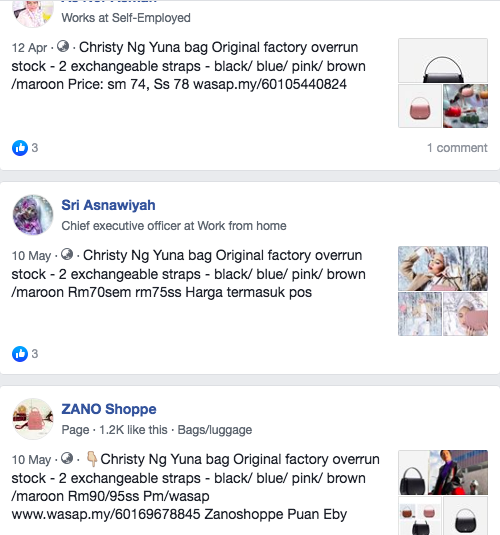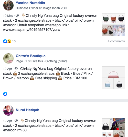 A quick look at Facebook only showed us that there are many more accounts online selling what seems to be fake Yuna x Christy Ng bags.