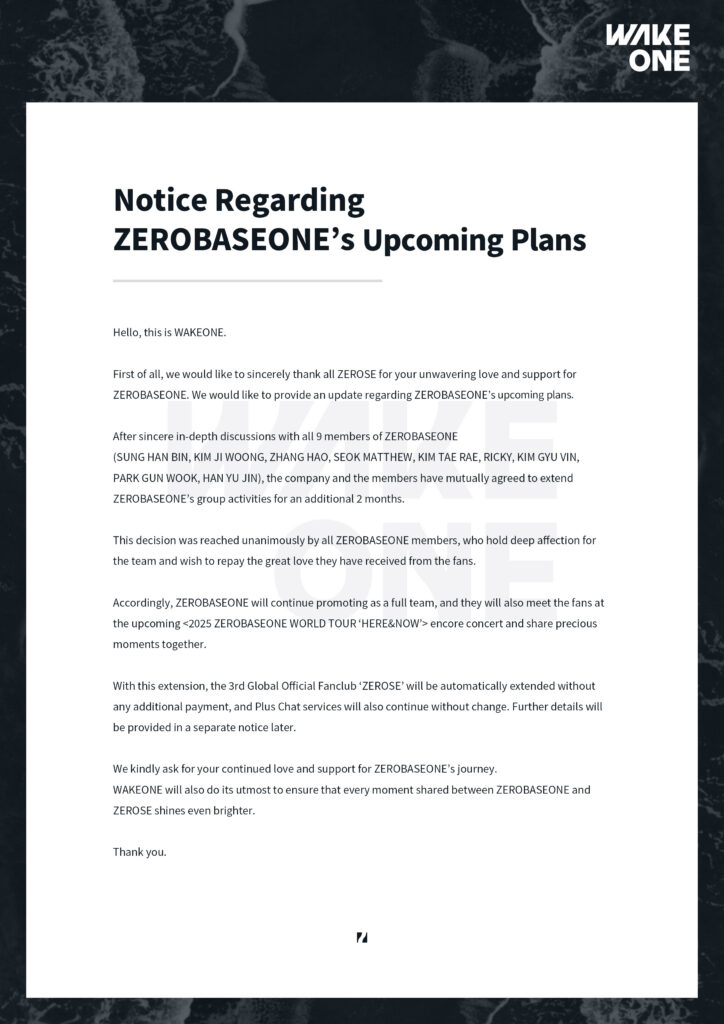 On 1st December 2025 (Monday), ZEROBASEONE’s agency, WakeOne, announced that all nine members and the company have mutually agreed to extend their group activities for an additional two months. As part of their formation under “Boys Planet”, the group was scheduled to disband in January 2026, two years and six months after their debut in July 2023.