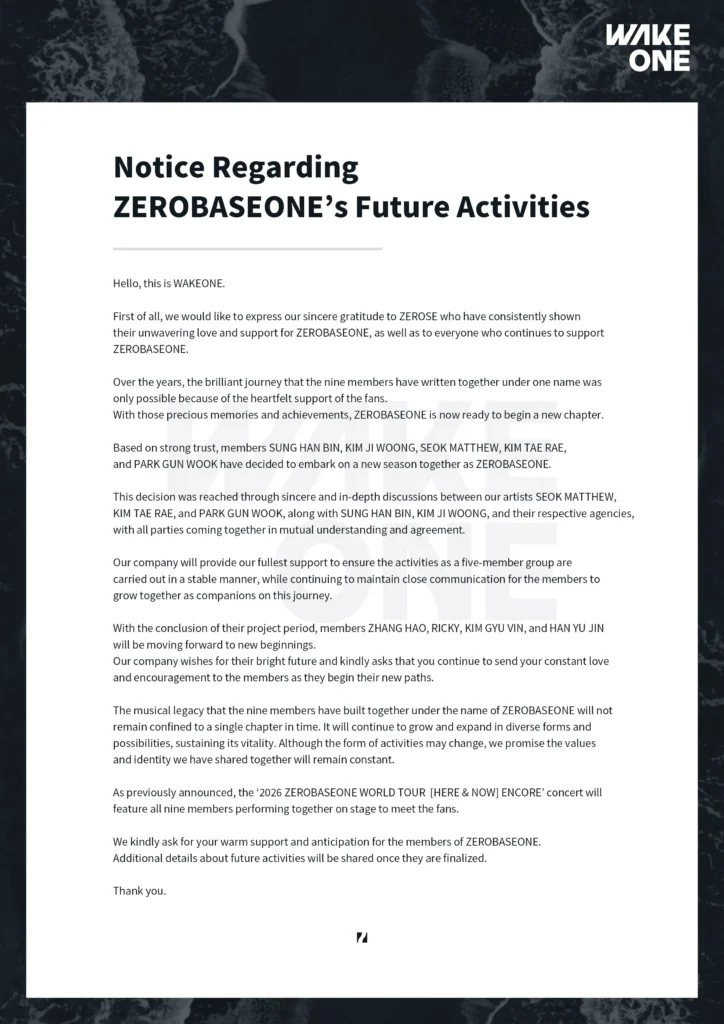 In its statement, WAKEONE announced that ZEROBASEONE will continue promoting with five out of nine of its members, Sung Han Bin (성한빈), Kim Ji Woong (김지웅), Seok Matthew (석매튜), Kim Tae Rae (김태래) and Park Gun Wook (박건욱). Meanwhile, Zhang Hao (장하오), Ricky (리키), Kim Gyu Vin (김규빈) and Han Yu Jin (한유진), who are all under YH Entertainment, will part ways with the group after March 2026.