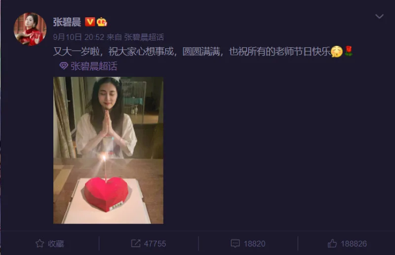 Zhang celebrated her birthday a few days ago on 10th September. She posted a simple photo on Weibo of her making a wish over a heart shaped cake. She even wore a cute crown depicting her as the birthday girl. The caption read: “I’m one year older. I wish you all the best and I wish all the teachers a happy holiday.”