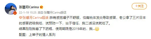 On 19th January, Carina shared a little story with her followers on Weibo. “Last night, I felt that my throat was uncomfortable,” she said. “I was afraid my tonsils would be inflamed and I would catch a cold.” Of course, Raymond took up his husbandly duties and fetched his wife some medicine. Carina specified that they were from Japan, and that she took them as a precaution. “Out of trust, I took (the medicine) without saying a word.” However, she was shocked to discover that the expiration date on the bottles were 2019.