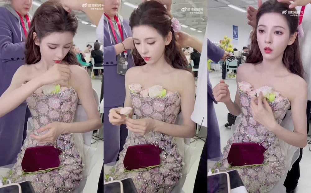 While the dress looked lovely at a glance, it was not moulded to her body and apparently left a fairly large gap between her chest and the front of the dress. As such, to avoid exposing herself, while doing touch up for her makeup, Yuxi was seen artfully filling her cleavage with flowers.