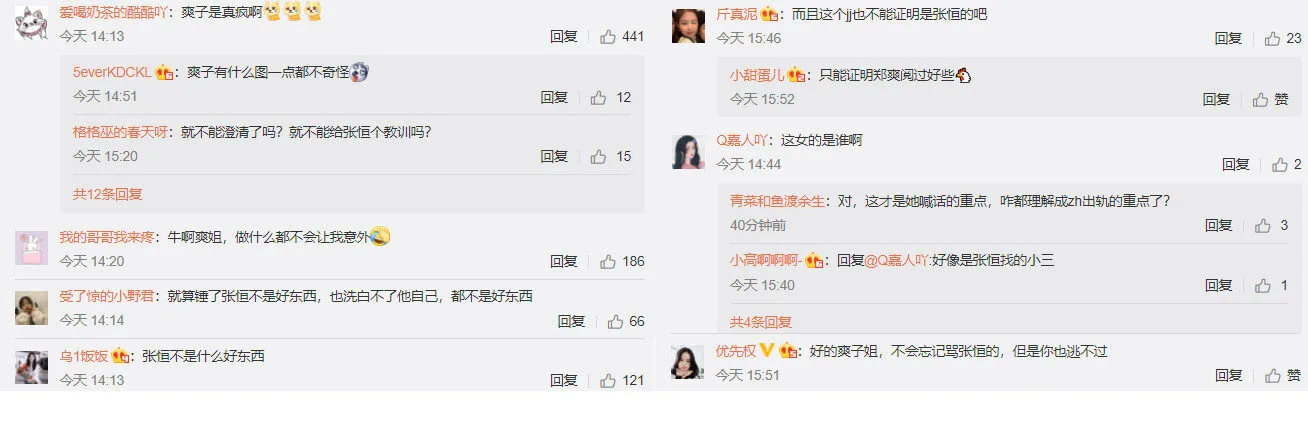 Zheng Shuang’s supposed account has not brought up the subject again and Zhang Heng is keeping quiet about the matter. The situation seems to have settled for now, albeit uneasily.