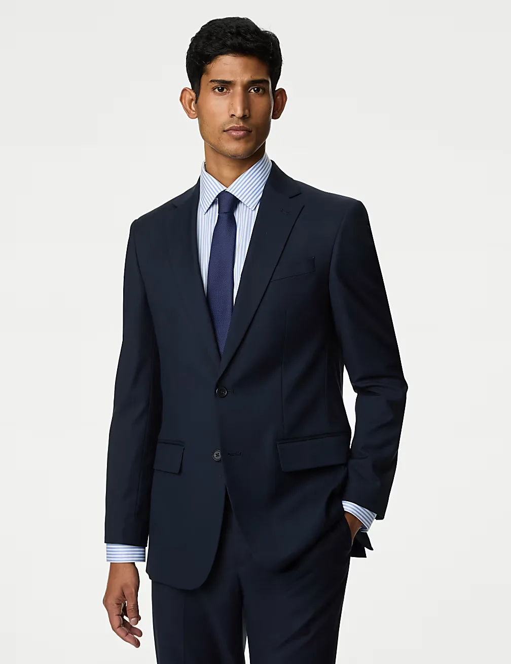 Elevate your formal attire with this smart suit jacket, tailored to a comfortable regular fit with added stretch for ease of movement. Designed with an innovative active waist, it ensures a superb fit and freedom of movement throughout the day. Features include notch lapels and twin back vents for a sophisticated finish.