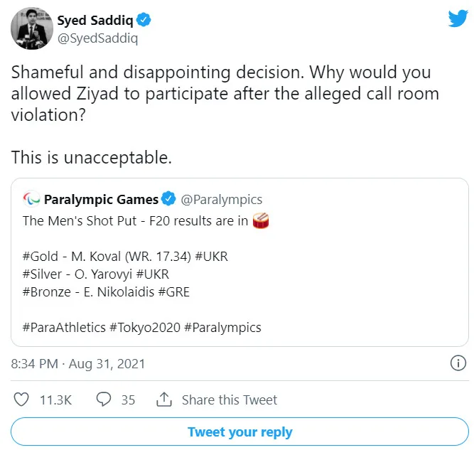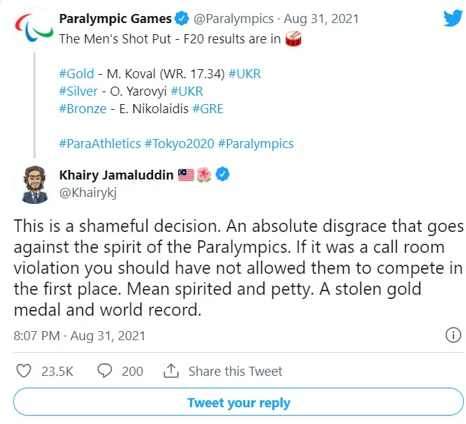 “This is a shameful decision. An absolute disgrace that goes against the spirit of the Paralympics. If it was a call room violation, you should have not allowed them to compete in the first place. Mean spirited and petty. A stolen gold medal and world record,” said the former youth and sports minister.